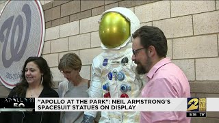 The suit, standing over six feet tall with a gold face mask is an imposing presence, looking as if Armstrong himself was standing in the business waiting his next command. The suits were installed at the ballparks in mid-July to commemorate the 50th anniversary of the lunar landing and famous space stroll. Federici was a child when the event took place but recalled the reaction back on Earth.